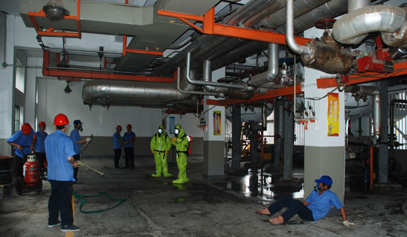 由行政組織安委會(huì)成員、各車間部門第一責(zé)任人、車間安全員等30余人,模擬樹脂車間反應(yīng)釜熱媒發(fā)生泄漏、并引發(fā)火災(zāi)事故,開展應(yīng)急救援。首先從發(fā)現(xiàn)、初期處理、報(bào)警;到接警、發(fā)布警報(bào)傷員救護(hù);第三發(fā)布疏散命令、人員緊急疏散;第四救援隊(duì)伍到達(dá);第五向各隊(duì)發(fā)布命令;第六環(huán)境監(jiān)測;第七任務(wù)完成、報(bào)告;第八現(xiàn)場泄漏物料處理、清洗;第九解除警報(bào);第十預(yù)案演練總結(jié)、講評。十個(gè)步驟均一絲不茍地嚴(yán)格按照程序開展,得到公司領(lǐng)導(dǎo)的好評。